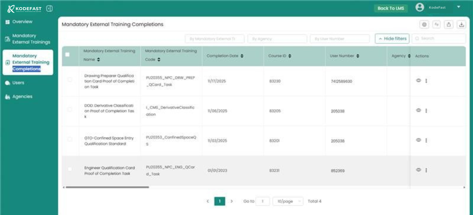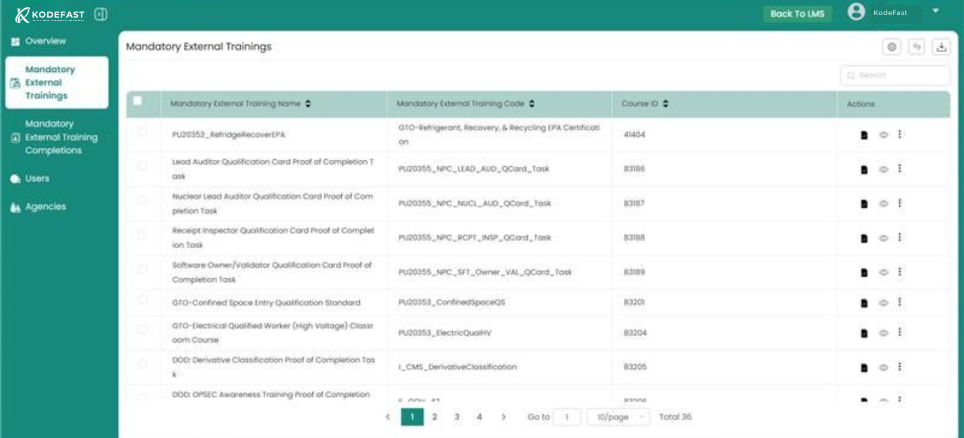 KodeFast’s Certificate Management module provides a flexible framework for assigning, tracking, and storing training certificates. It supports integration with learning systems, secure file transfer protocols, and cloud-based storage, making it adaptable to various organizational workflows and technology stacks.